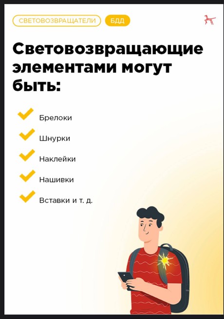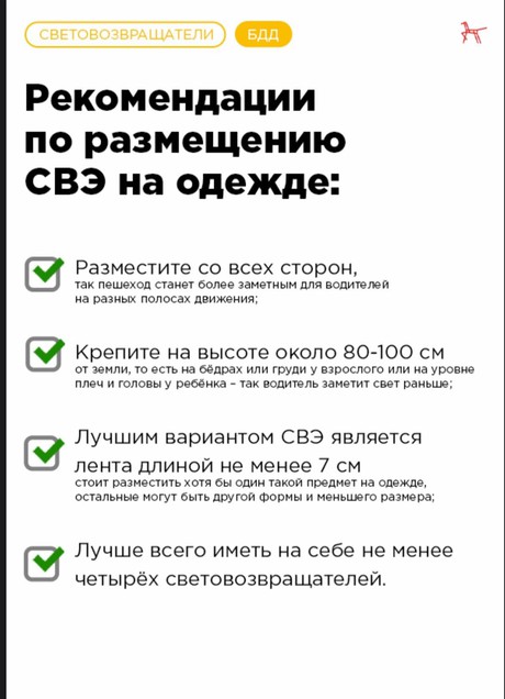 В рамках профилактики детского дорожно- транспортного травматизма, Напоминаем Вам о необходимости ношения световозвращающих элементов на одежде Предлагаем Вашему вниманию рекомендации по размещению световозвращающих элементов на одежде, представленные Федеральным ресурсным центром по профилактики детского дорожно-транспортного травматизма Института воспитания.