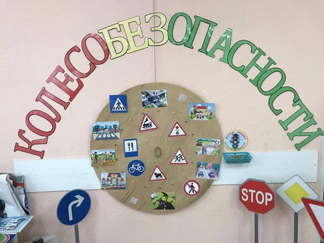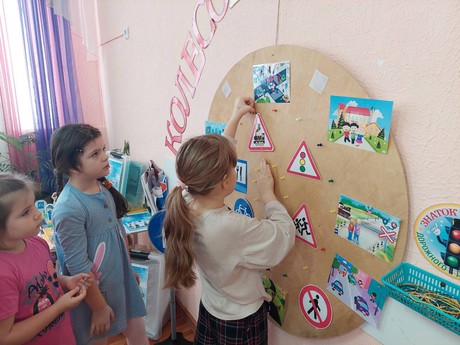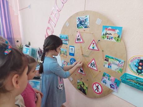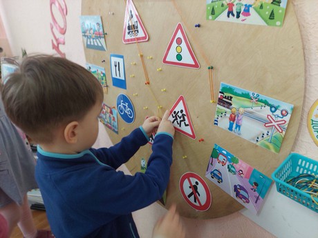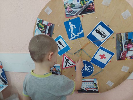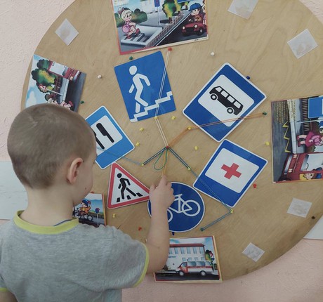 "Картинки"- съемные, в зависимости от темы и условия игры, они меняются. Так, напимер, если перед детьми стоит задача: "Найти нужный знак, соотнести его с "опредленной ситуации", то на "КОЛЕСЕ БЕЗ-ОПАСНОСТИ" ребенок видит ряд картинок, с различными ситуациями (совершение перехода проезжей части, езда на велосипеде, и т.д.), и ряд "дорожных знаков", которые нужно соединить с той или иной "ситуацией". С помощью цветных резинок, которые крепятся на "гвоздиках", ребенок "проводит" своеобразную линию, соединяющую дорожный знак и ситуацию на дороге.