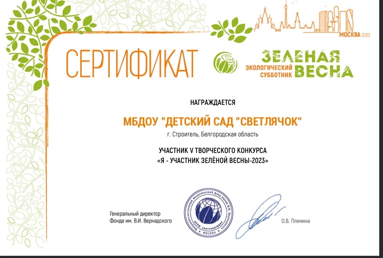 Коллектив педагогов и воспитанников приняли участие в экологическом творческом конкурсе «Я – УЧАСТНИК «ЗЕЛЕНОЙ ВЕСНЫ». Конкурс проводится в рамках экологического субботника «Зеленая Весна» с целью продвижения экологических практик и инициатив, и популяризации эковолонтерской деятельности.