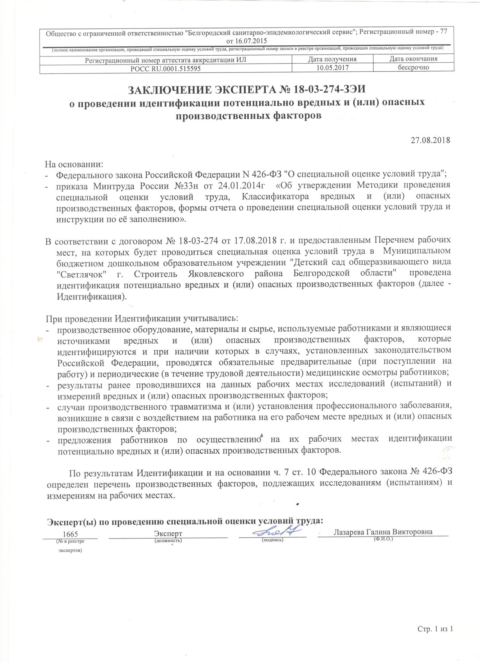 ЗАКЛЮЧЕНИЕ ЭКСПЕРТА по результатам проведения идентификации потенциально вредных и (или) опасных производственных факторов