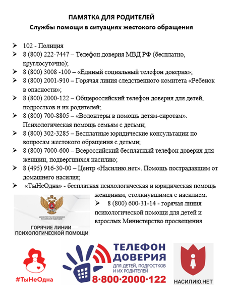 Памятка. Службы помощи в ситуациях жестокого обращения.