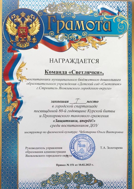 Воспитанники группы «Солнышко», вместе с инструктором по ФК, Чеботаревой О.В., приняли участие в городской спартакиаде, посвящённой 80-й годовщине Курской битвы и Прохоровского танкового сражения: «Защитники, вперёд!»среди воспитанников ДОУ.