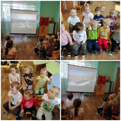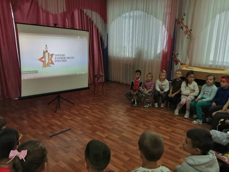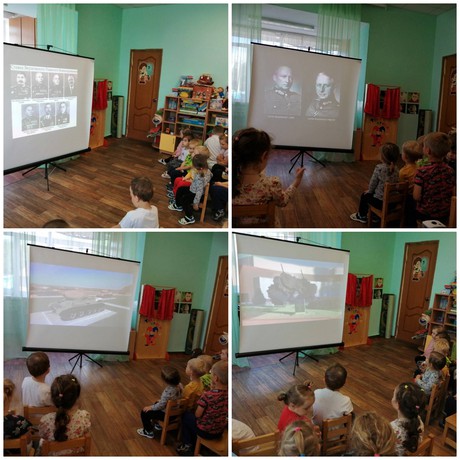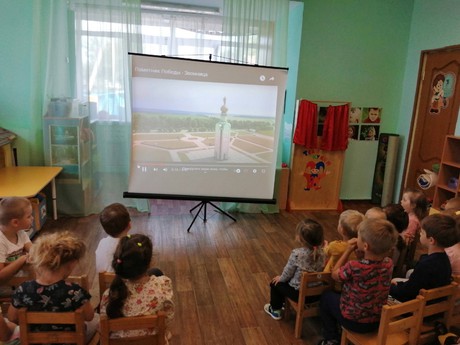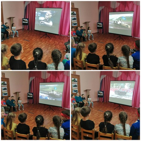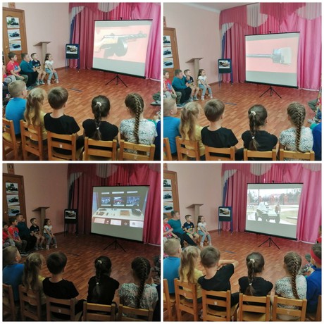 В ходе беседы, ребятам был показан видеофильм «Танковый таран Александра Николаева» (https://www.youtube.com/watch?v=J5qRHKYe9Aw); и познавательный видеоролик «Памятник Победы – Звонница» (https://www.youtube.com/watch?v=IXadV2SkNhw)
